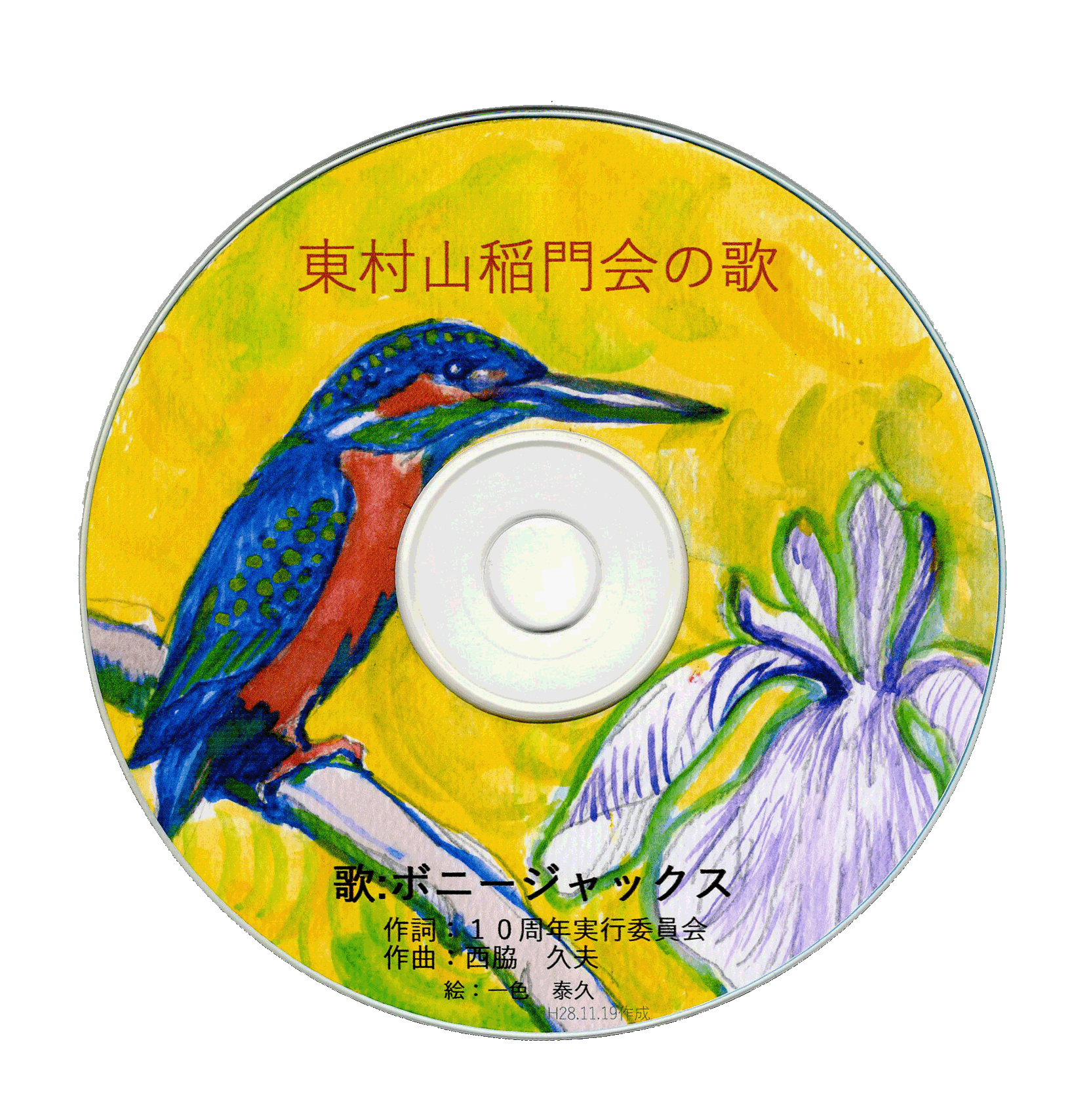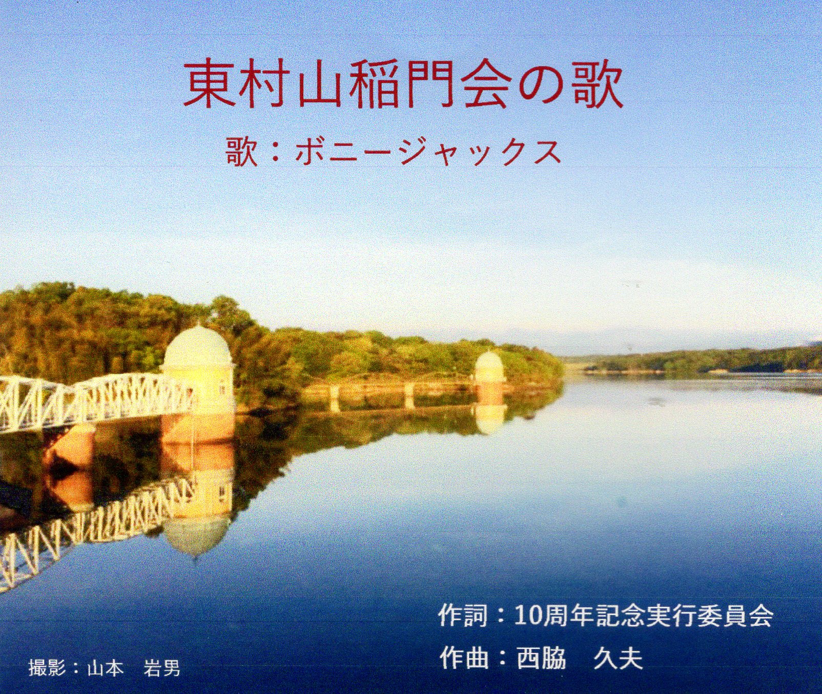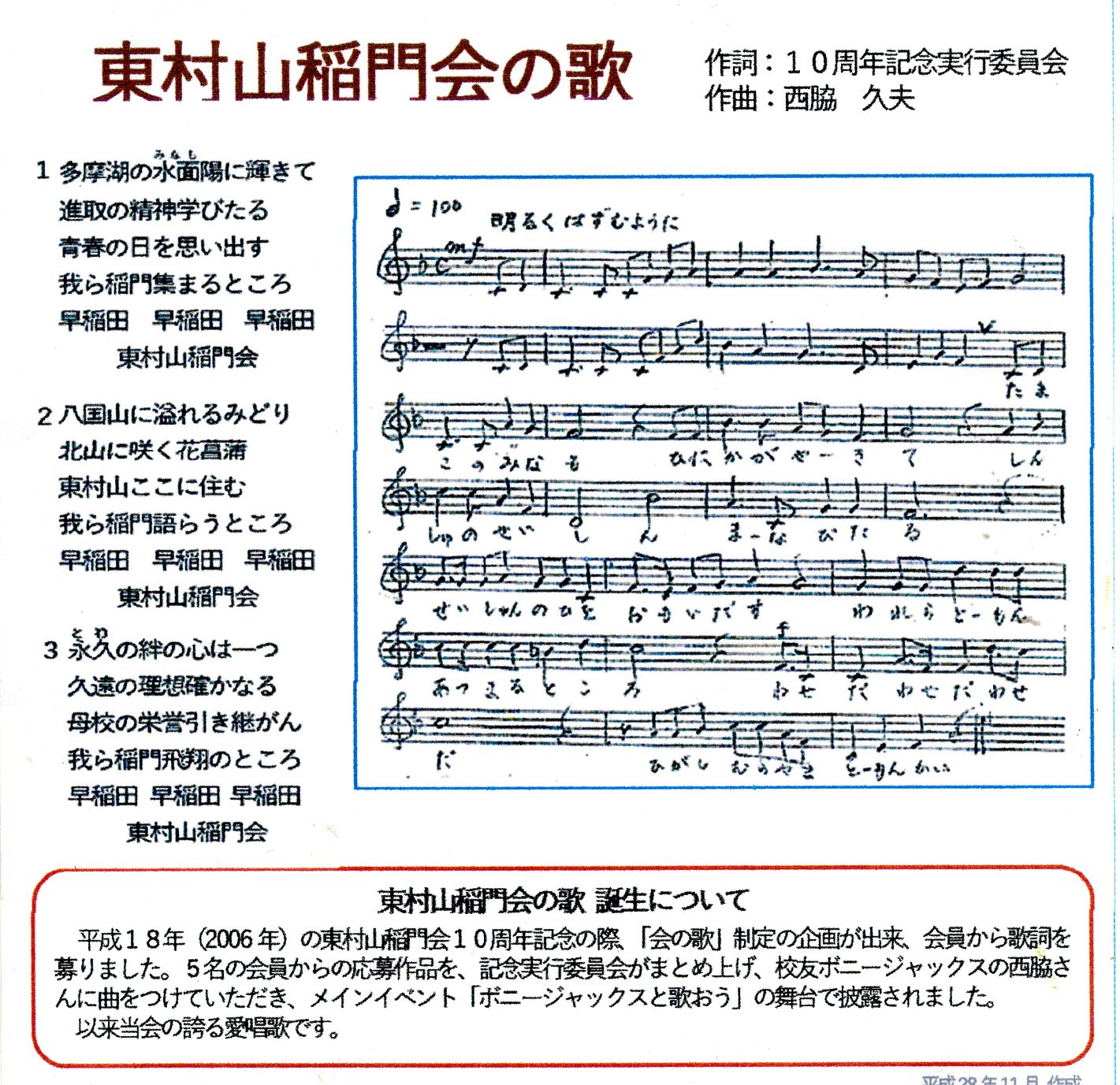 平成18年(2006年)東村山稲門会は創立10周年を迎えました。記念の企画として「会の歌」制定案が持ち上がり、会員から歌詞を募ったところ5名の会員から応募がありました。それを記念祭実行委員会がまとめ上げ、校友ボニージャックスの西脇さんに曲をつけて頂き、市民の皆様も参加頂いたメインイベント「ボニージャックスと歌おう」の舞台で披露されました。以来当会の集まりでは必ず歌われる誇るべき愛唱歌となっております。